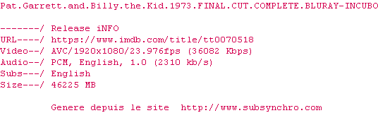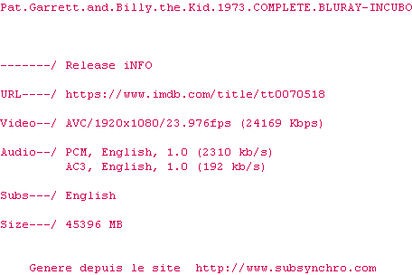 Voir le nfo de la release Pat.Garrett.And.Billy.The.Kid.1973.FINAL.CUT.COMPLETE.BLURAY-INCUBO