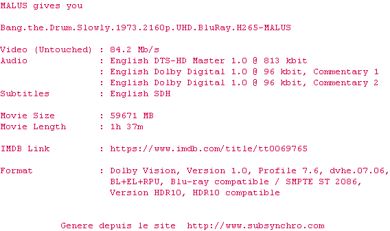 Voir le nfo de la release Bang.The.Drum.Slowly.1973.2160p.UHD.BluRay.H265-MALUS