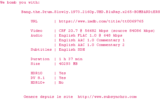 Voir le nfo de la release Bang.The.Drum.Slowly.1973.2160p.UHD.BluRay.x265-B0MBARDiERS