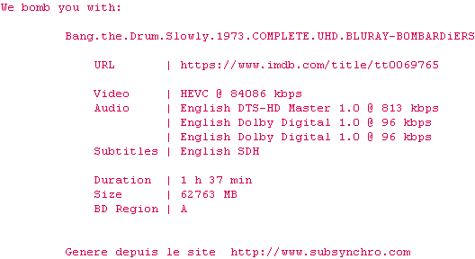 Voir le nfo de la release Bang.The.Drum.Slowly.1973.COMPLETE.UHD.BLURAY-B0MBARDiERS