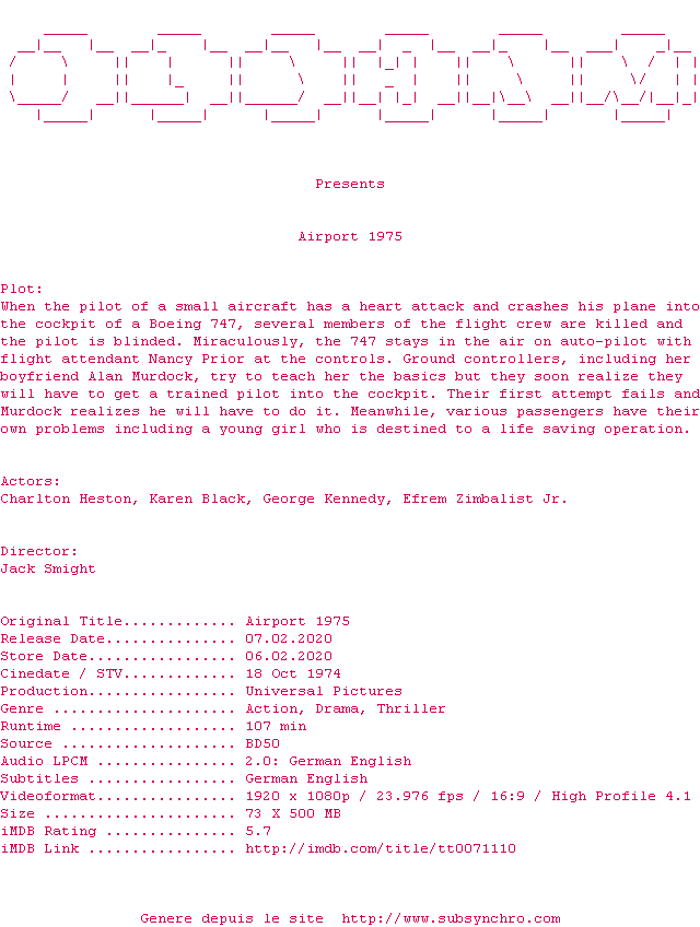Voir le nfo de la release Airport.1975.1974.MULTi.COMPLETE.BLURAY-OLDHAM