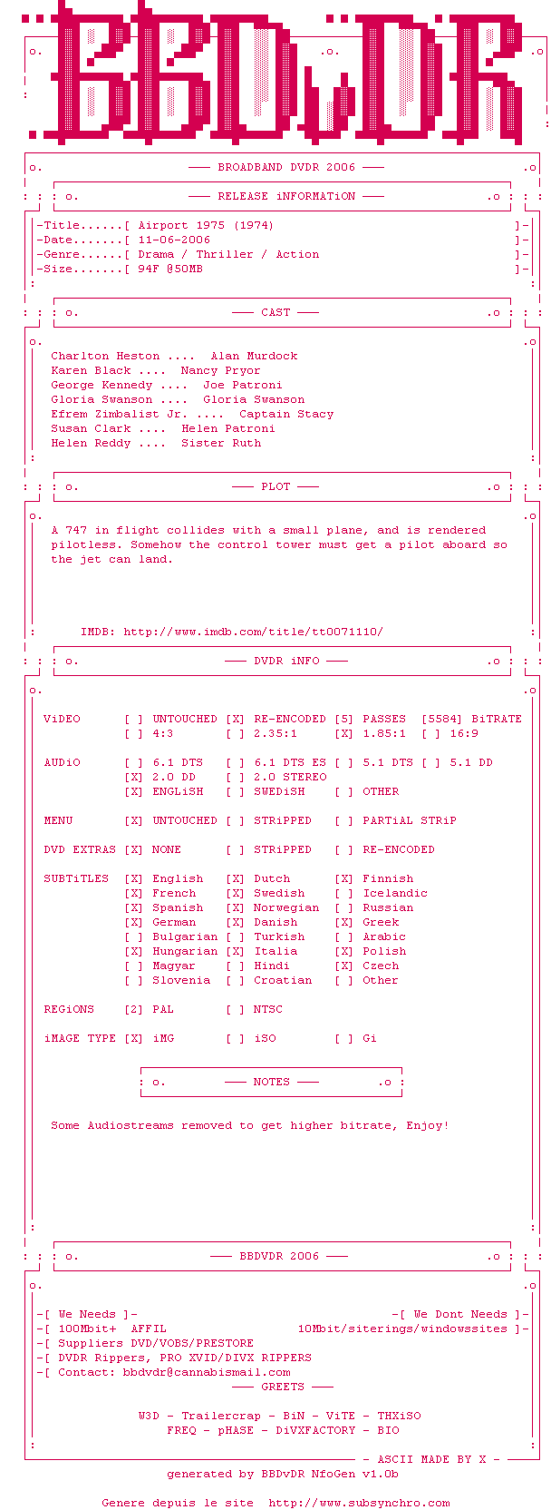 Voir le nfo de la release Airport.1975.1974.MULTiSUBS.PAL.DVDR-BBDvDR
