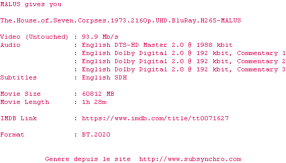 Y avez-vous pense ? Nous proposons déjà 1902 sous-titres pour le film Le Manoir aux sept cadavres. Avez-vous essaye de voir si ces sous-titres etaient compatibles avec cette release ? On vous laisse le soin de tester cela pour nous et de contribuer au site en postant le sous-titre en cas de compatiblite constatee !
