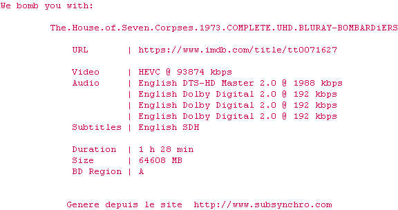 Y avez-vous pense ? Nous proposons déjà 1902 sous-titres pour le film Le Manoir aux sept cadavres. Avez-vous essaye de voir si ces sous-titres etaient compatibles avec cette release ? On vous laisse le soin de tester cela pour nous et de contribuer au site en postant le sous-titre en cas de compatiblite constatee !