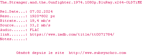 Voir le nfo de la release The.Stranger.And.The.Gunfighter.1974.1080p.BluRay.x264-OLDTiME