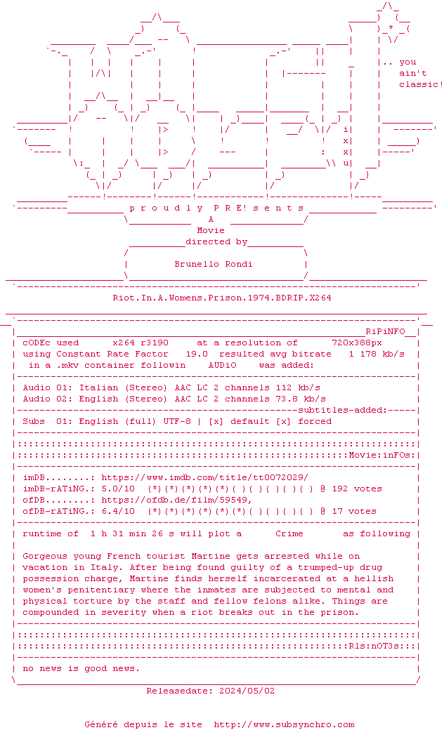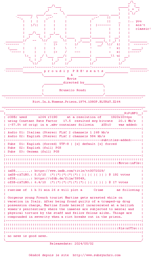 Voir le nfo de la release Riot.In.A.Womens.Prison.1974.1080P.BLURAY.x264-WATCHABLE