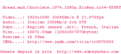 Y avez-vous pense ? Nous proposons déjà 1630 sous-titres pour le film Pain et chocolat / Bread and Chocolate. Avez-vous essaye de voir si ces sous-titres etaient compatibles avec cette release ? On vous laisse le soin de tester cela pour nous et de contribuer au site en postant le sous-titre en cas de compatiblite constatee !