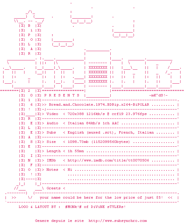 Y avez-vous pense ? Nous proposons déjà 1630 sous-titres pour le film Pain et chocolat / Bread and Chocolate. Avez-vous essaye de voir si ces sous-titres etaient compatibles avec cette release ? On vous laisse le soin de tester cela pour nous et de contribuer au site en postant le sous-titre en cas de compatiblite constatee !