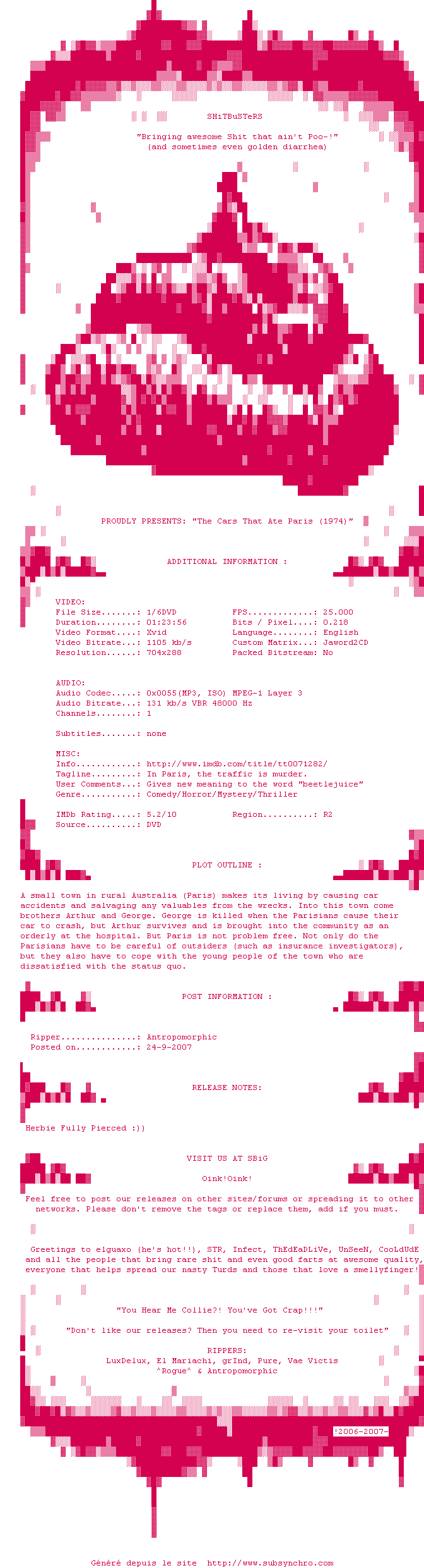 Voir le nfo de la release The.Cars.That.Ate.Paris.1974.DVDRip.XVID-ShitBusters