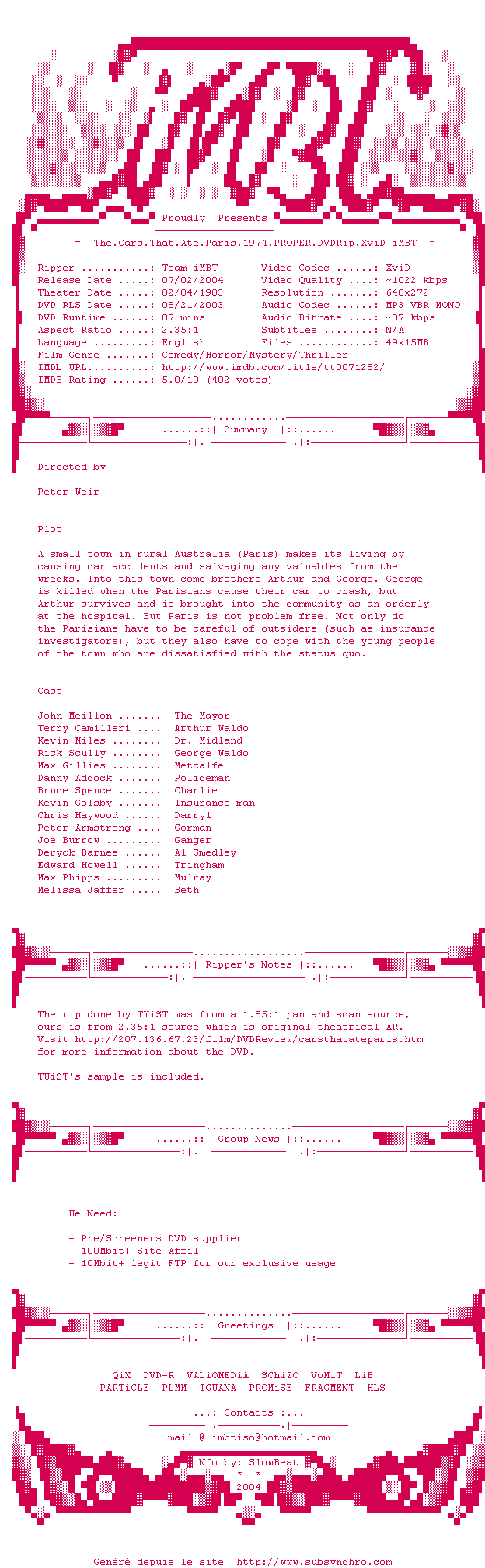 Voir le nfo de la release The.Cars.That.Ate.Paris.1974.PROPER.DVDRip.XviD-iMBT