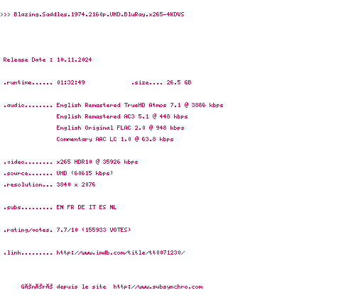 Voir le nfo de la release Blazing.Saddles.1974.MULTi.2160p.UHD.BluRay.x265-UKDHD