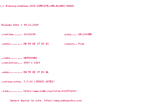 Voir le nfo de la release Blazing.Saddles.1974.COMPLETE.UHD.BLURAY-4KDVS
