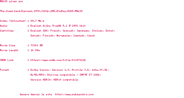 Voir le nfo de la release The.Sugarland.Express.1974.2160p.UHD.BluRay.H265-MALUS