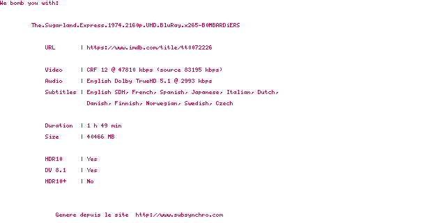 Voir le nfo de la release The.Sugarland.Express.1974.2160p.UHD.BluRay.x265-B0MBARDiERS