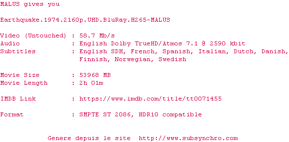 Voir le nfo de la release Earthquake.1974.2160p.UHD.BluRay.H265-MALUS