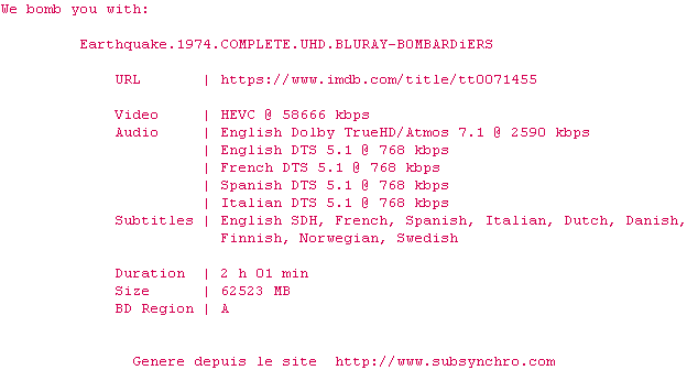 Voir le nfo de la release Earthquake.1974.UHD.BluRay.2160p.HDR10.HEVC.TrueHD.Atmos.7.1.x265-E