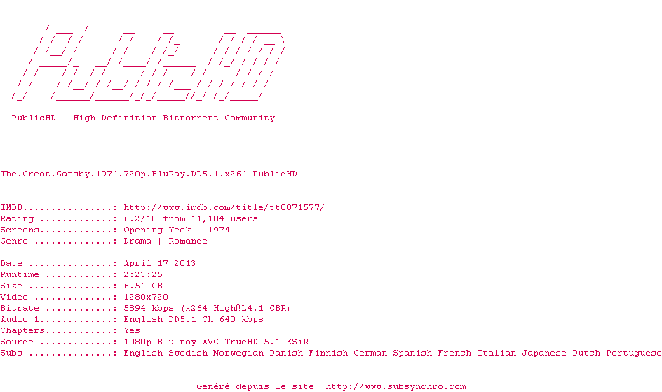 Telechargez le RSS « Fichier de la release The.Great.Gatsby.1974.720p.BluRay.DD5.1.x264-PublicHD »