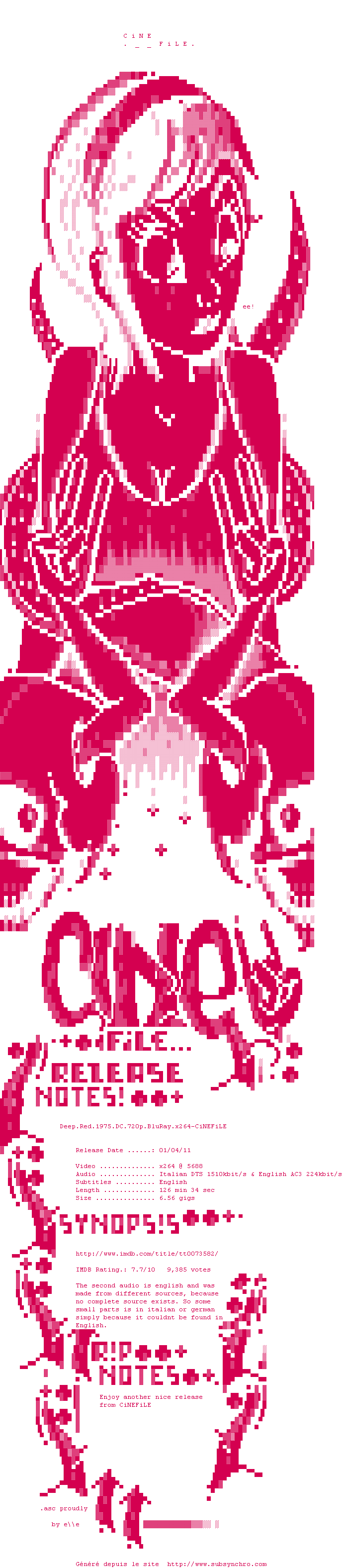 Voir le nfo de la release Deep.Red.1975.REMASTERED.EXPORT.VERSION.720p.BluRay.x264-ARCHiViST