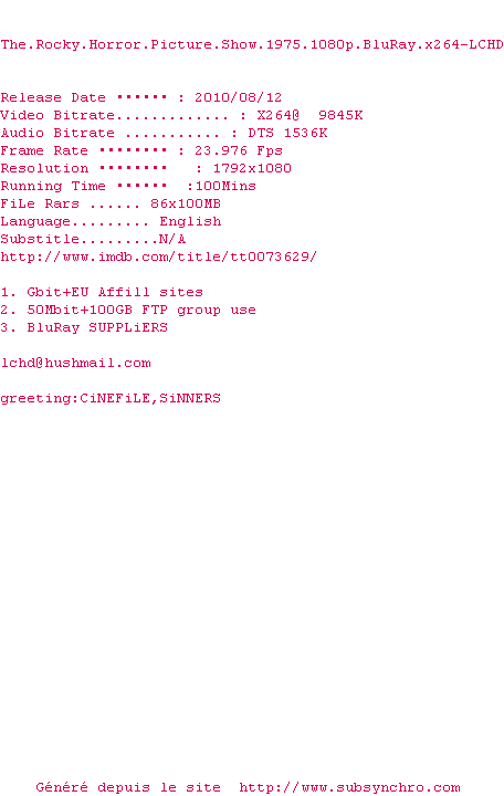 Voir le nfo de la release The.Rocky.Horror.Picture.Show.1975.1080p.BluRay.x264-LCHD