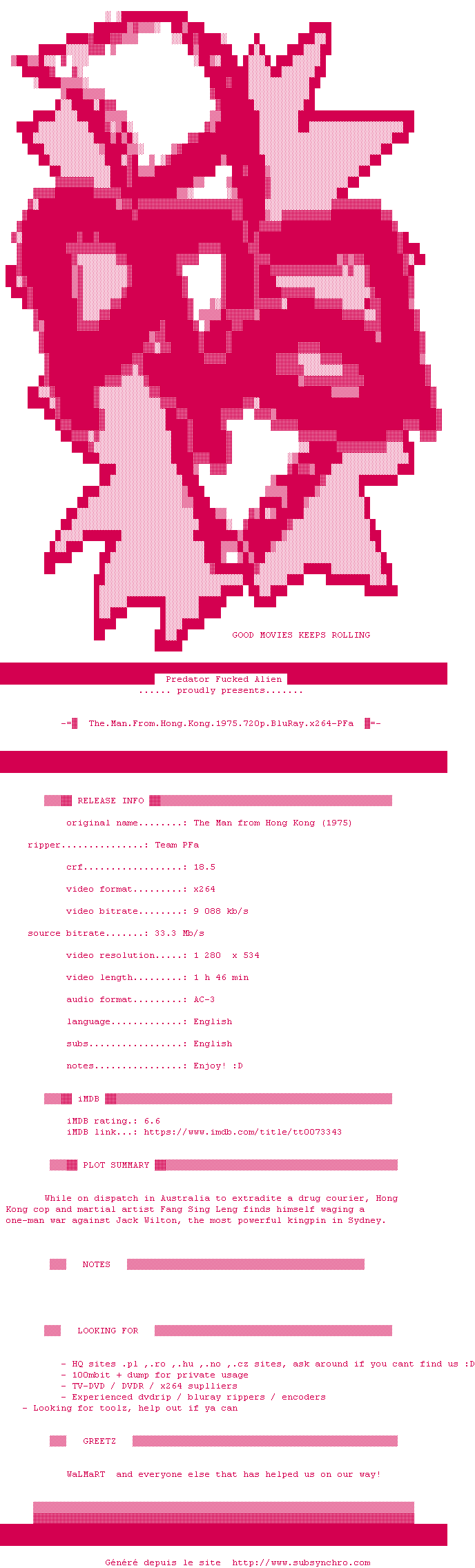 Voir le nfo de la release The.Man.From.Hong.Kong.1975.720p.BluRay.x264-PFa
