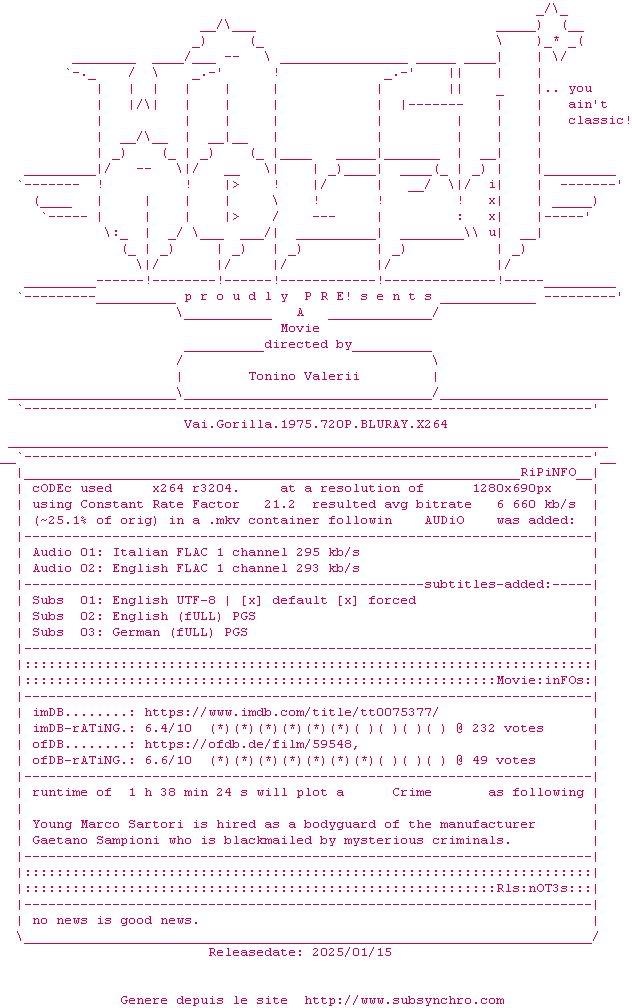 Voir le nfo de la release Vai.Gorilla.1975.720P.BLURAY.x264-WATCHABLE