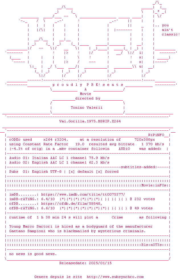 Voir le nfo de la release Vai.Gorilla.1975.BDRIP.x264-WATCHABLE