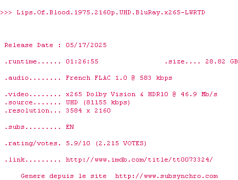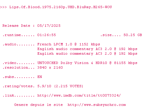 Voir le nfo de la release Lips.Of.Blood.1975.2160p.UHD.BluRay.H265-WOU