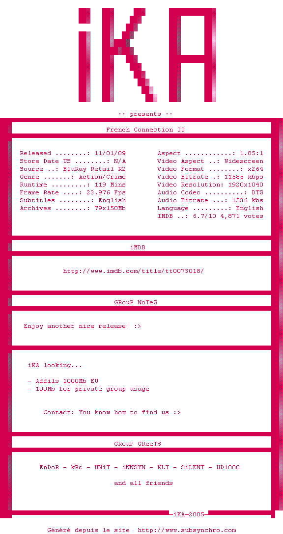 | Voir le nfo de la release French.Connection.II.1975.1080p.BluRay.x264-iKA | iKA | French.Connection.II.1975.1080p.BluRay.x264-iKA OpenSubtitles | 0 fichier | ||