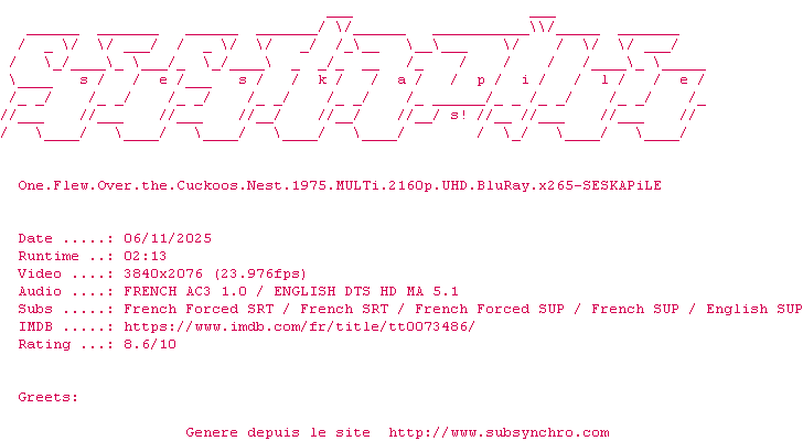 Voir le nfo de la release One.Flew.Over.The.Cuckoos.Nest.1975.MULTi.2160p.UHD.BluRay.x265-SESKAPiLE