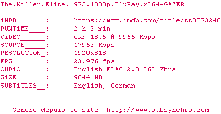 Voir le nfo de la release The.Killer.Elite.1975.1080p.BluRay.x264-GAZER