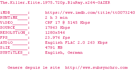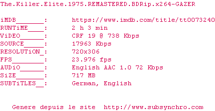 Voir le nfo de la release The.Killer.Elite.1975.REMASTERED.BDRip.x264-GAZER
