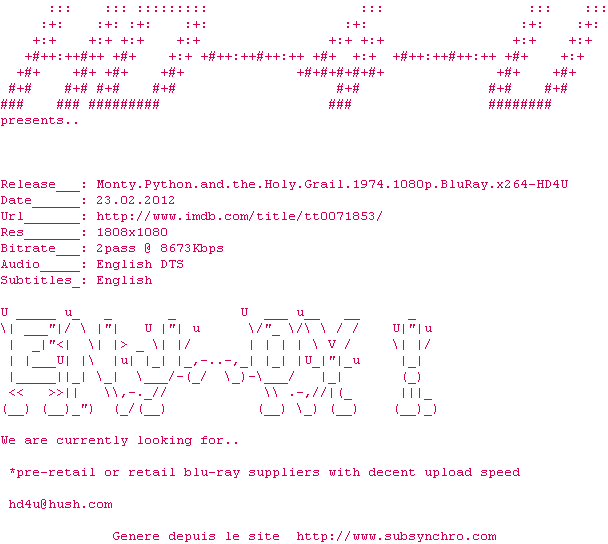 Telechargez le RSS « Fichier de la release Monty.Python.and.the.Holy.Grail.1974.1080p.BluRay.x264-HD4U »