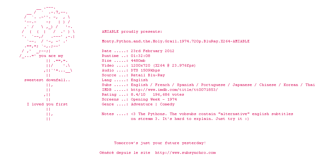 Telechargez le RSS « Fichier de la release Monty.Python.and.the.Holy.Grail.1974.720p.BluRay.X264-AMIABLE »