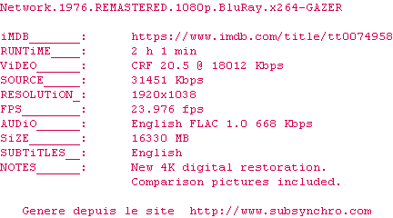 Y avez-vous pense ? Nous proposons déjà 1127 sous-titres pour le film Network : Main basse sur la TV. Avez-vous essaye de voir si ces sous-titres etaient compatibles avec cette release ? On vous laisse le soin de tester cela pour nous et de contribuer au site en postant le sous-titre en cas de compatiblite constatee !