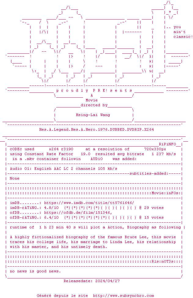 Voir le nfo de la release Hes.A.Legend.Hes.A.Hero.1976.DUBBED.DVDRIP.x264-WATCHABLE