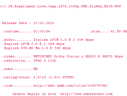 Telechargez le RSS « Fichier de la release SS.Experiment.Love.Camp.1976.2160p.UHD.BluRay.H265-WOU »
