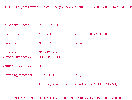 Telechargez le RSS « Fichier de la release SS.Experiment.Love.Camp.1976.COMPLETE.UHD.BLURAY-LWRTD »