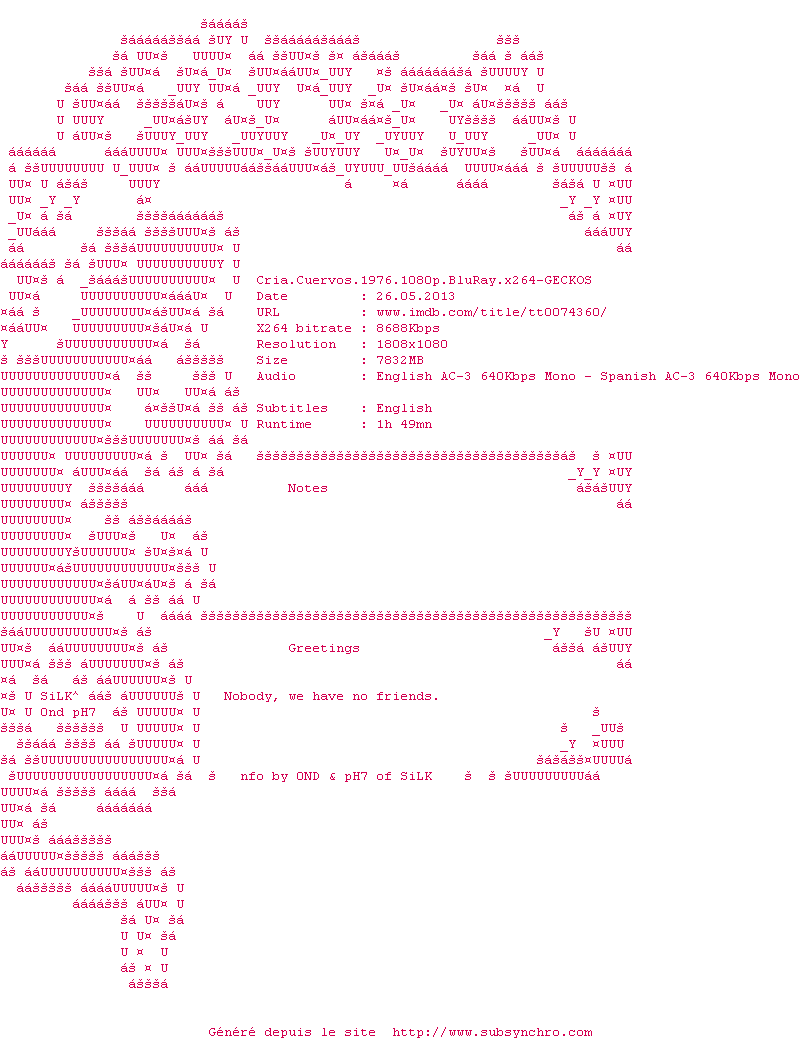 Voir le nfo de la release Cria.Cuervos.1976.1080p.BluRay.x264-GECKOS