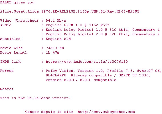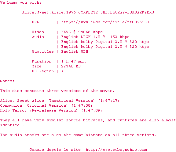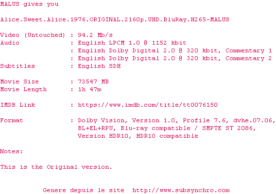 Voir le nfo de la release Alice.Sweet.Alice.1976.ORIGINAL.2160p.UHD.BluRay.H265-MALUS