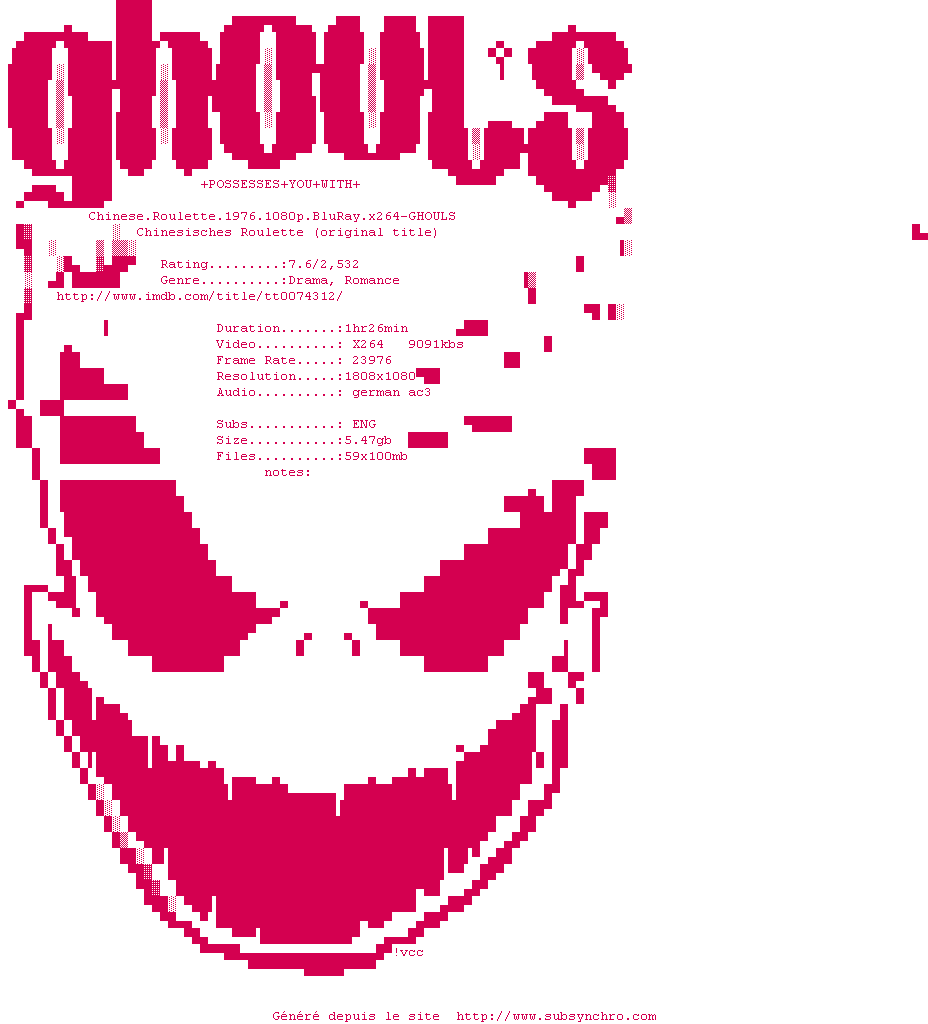 | Voir le nfo de la release Chinese.Roulette.1976.1080p.BluRay.x264-GHOULS | GHOULS | Chinese.Roulette.1976.1080p.BluRay.x264-GHOULS OpenSubtitles | 23/01/2017 | Disponible en Z2 | 1 fichier |
