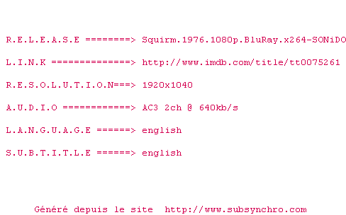 | Voir le nfo de la release Squirm.1976.720p.BluRay.x264-SONiDO | SONiDO | Squirm.1976.720p.BluRay.x264-SONiDO OpenSubtitles | 0 fichier | ||