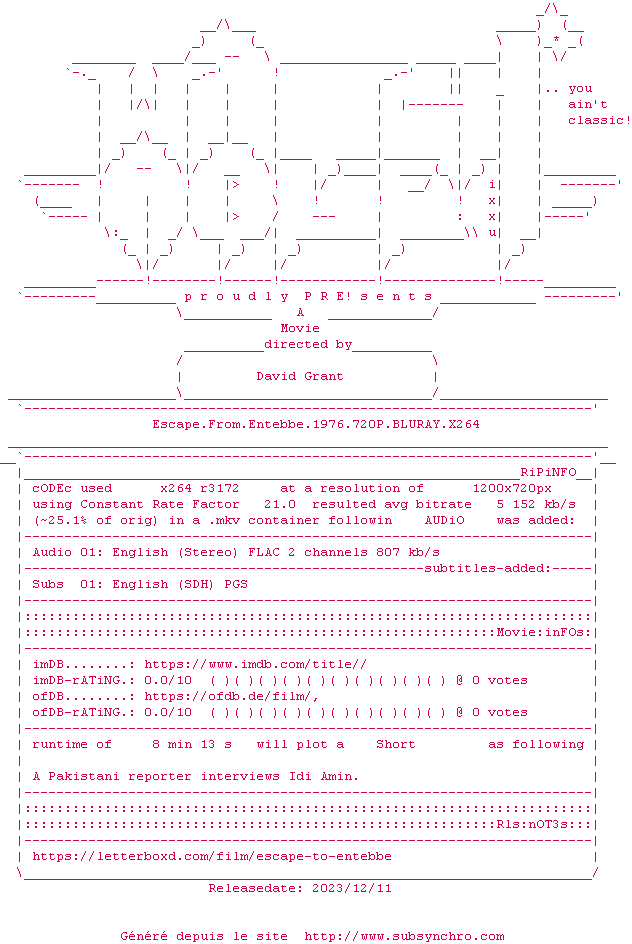 Voir le nfo de la release Escape.From.Entebbe.1976.1080P.BLURAY.H264-UNDERTAKERS