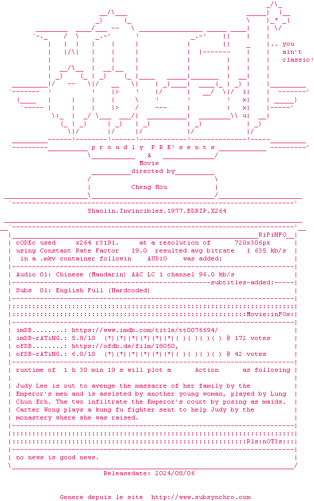Voir le nfo de la release Shaolin.Invincibles.1977.ALTERNATIVE.CUT.DUBBED.DVDRIP.x264-WATCHABLE