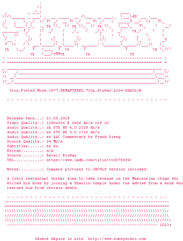 Voir le nfo de la release Iron.Fisted.Monk.1977.REMASTERED.COMPLETE.BLURAY-SHAOLiN