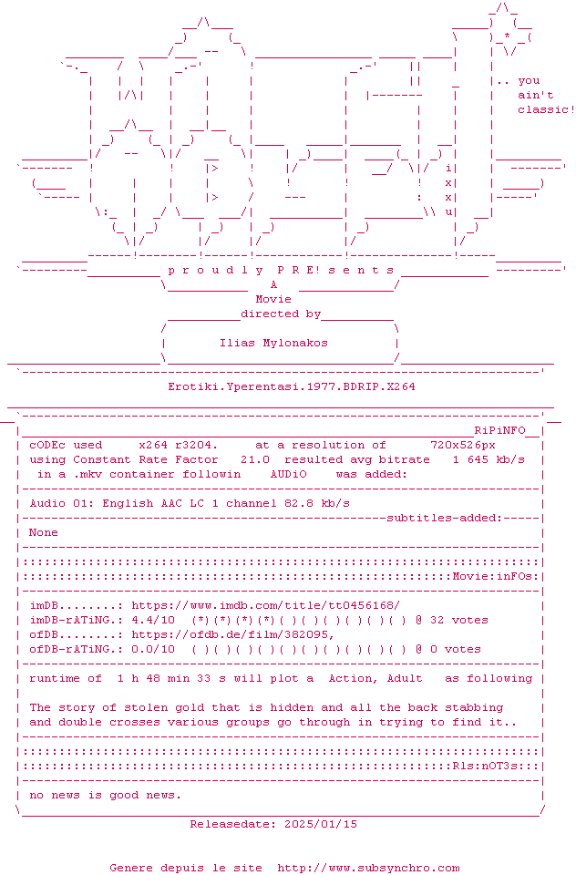 Voir le nfo de la release Erotiki.Yperentasi.1977.720P.BLURAY.x264-WATCHABLE