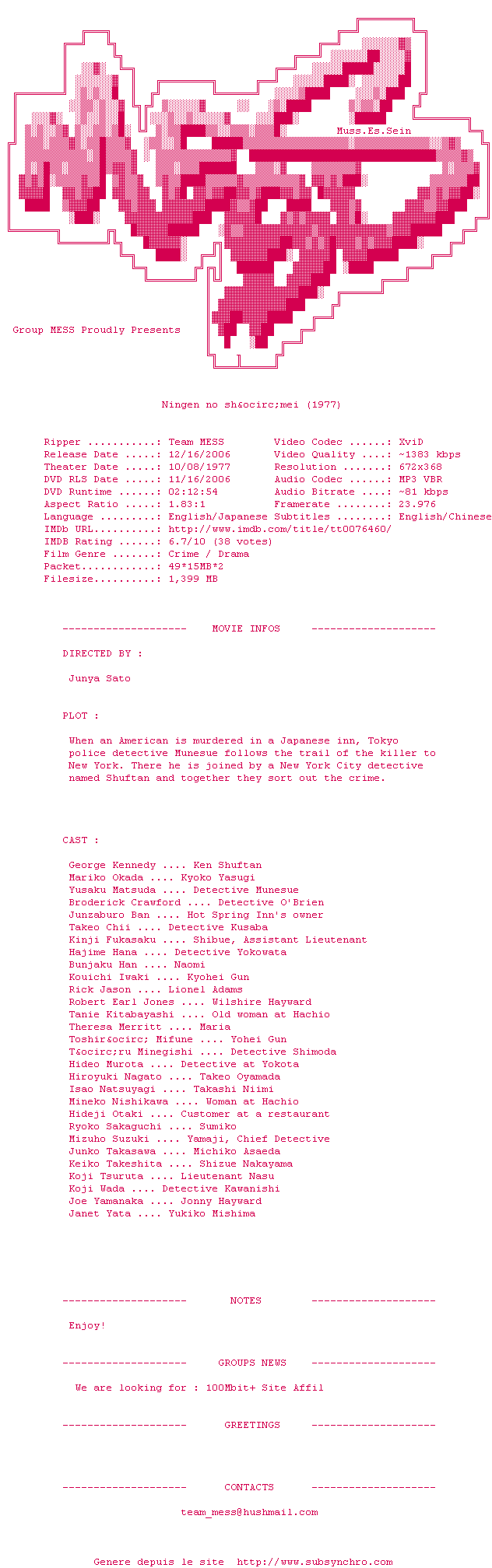 Y avez-vous pense ? Nous proposons déjà 2207 sous-titres pour le film Preuve d'un homme / Proof of the Man. Avez-vous essaye de voir si ces sous-titres etaient compatibles avec cette release ? On vous laisse le soin de tester cela pour nous et de contribuer au site en postant le sous-titre en cas de compatiblite constatee !