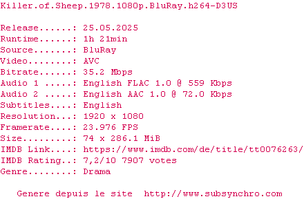 Voir le nfo de la release Killer.Of.Sheep.1978.COMPLETE.BLURAY-D3US