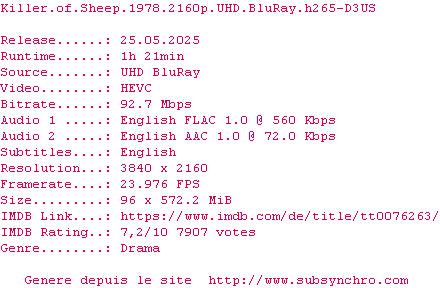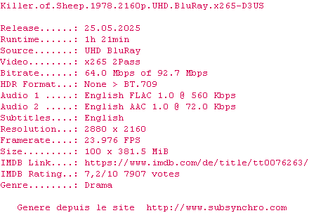 Voir le nfo de la release Killer.Of.Sheep.1978.2160p.UHD.BluRay.x265-D3US