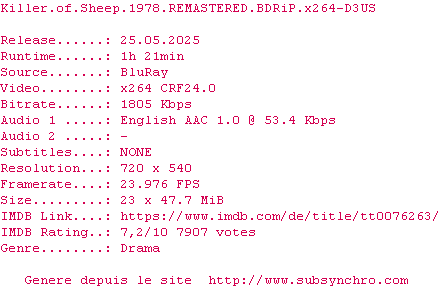 Voir le nfo de la release Killer.Of.Sheep.1978.REMASTERED.REPACK.BDRiP.x264-D3US