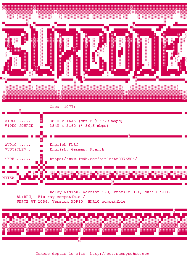 Voir le nfo de la release Orca.1977.2160p.UHD.BluRay.x265-SURCODE